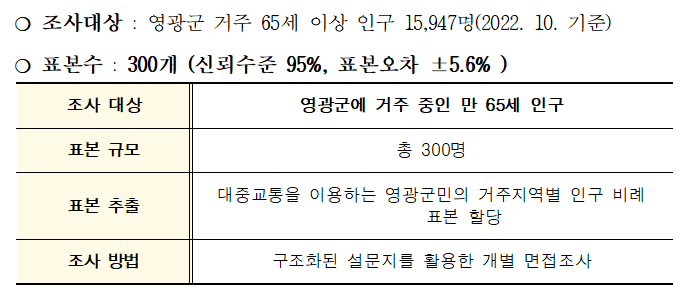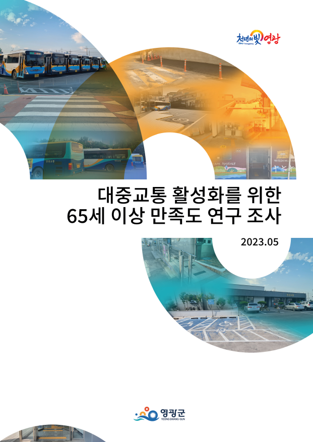 영광군에서 의뢰한 영광군 대중교통 활성화를 위한 65세 이상 만족도 조사 용역을 저희 학술연구 2팀이 성실히 완수하였습니다 저희 학술연구2팀에서는 영광군 노인인구의 대중교통 이용 활성화를 통해 포용적, 실질적, 체감적인 교통복지 실현을 도모하기 위한 정책자료로 활용하고자 영광군 65세 이상 군민들을 객관적으로 진단함으로써 문제점을 파악하고 개선과제를 도출하였습니다.